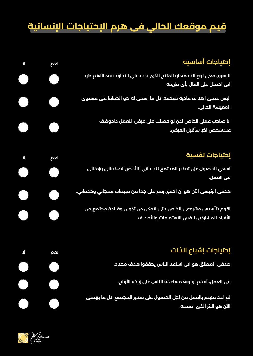 الاحتياجات الخمسة انا بعتبرها مسار واضح للانسان، وبناء عليها يقدر كل واحد فينا يقييم وضعه الحالي ويبدأ يحدد اهداف ويرسم خطط تساعده علي اشباع اهم احتياجاته اول بأول. التركيز علي الاحتياجات بيقلل الخيارات وبيساعدنا علي التركيز وتحسين اتخاذ القرارات خلال اي مرحلة.