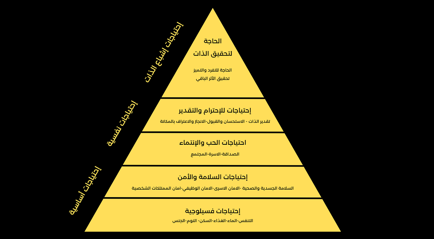 هنستعرض دلوقتي هرم ماسلو للإحتياجات واللي بعتبره بمثابة مسار واضح واولويات محدده لرحلة حياة كل انسان، انما طرق وسبل اشباع الاحتياجات تتوقف علي الخيارات المتاحة والظروف اللي بتختلف من شخص لآخر.